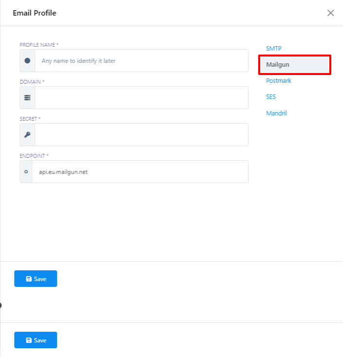 - Después de haber completado la información requerida, haga clic en el botón "Guardar" para finalizar la configuración de su perfil de Mailgun.