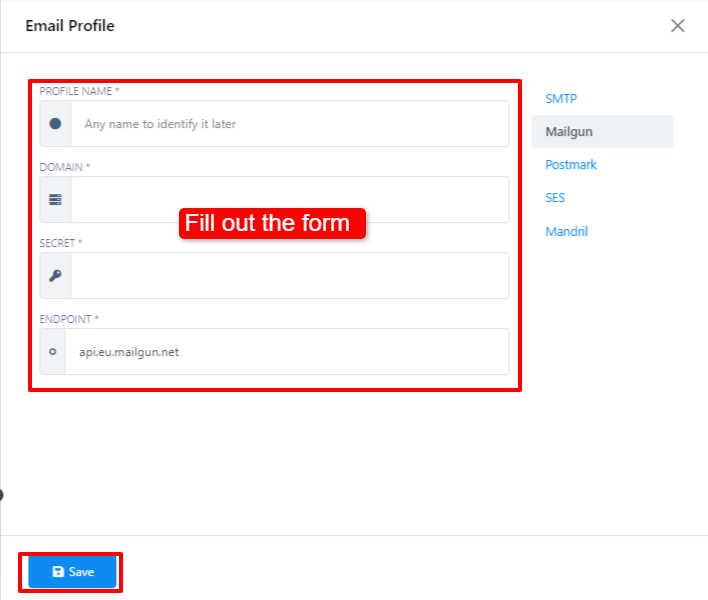 - Ahora, procede a completar el formulario para crear tu perfil de Mailgun. La información necesaria para completar este formulario se puede encontrar en su cuenta de Mailgun.