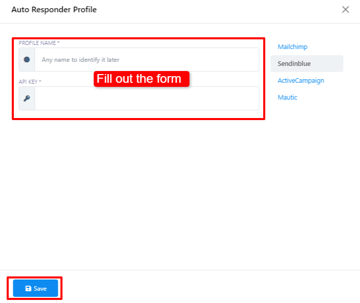 - A los efectos de esta guía, demostraremos el proceso utilizando Sendinblue como proveedor de servicios de respuesta elegido. Por tanto, haz clic en la opción `Sendinblue`.