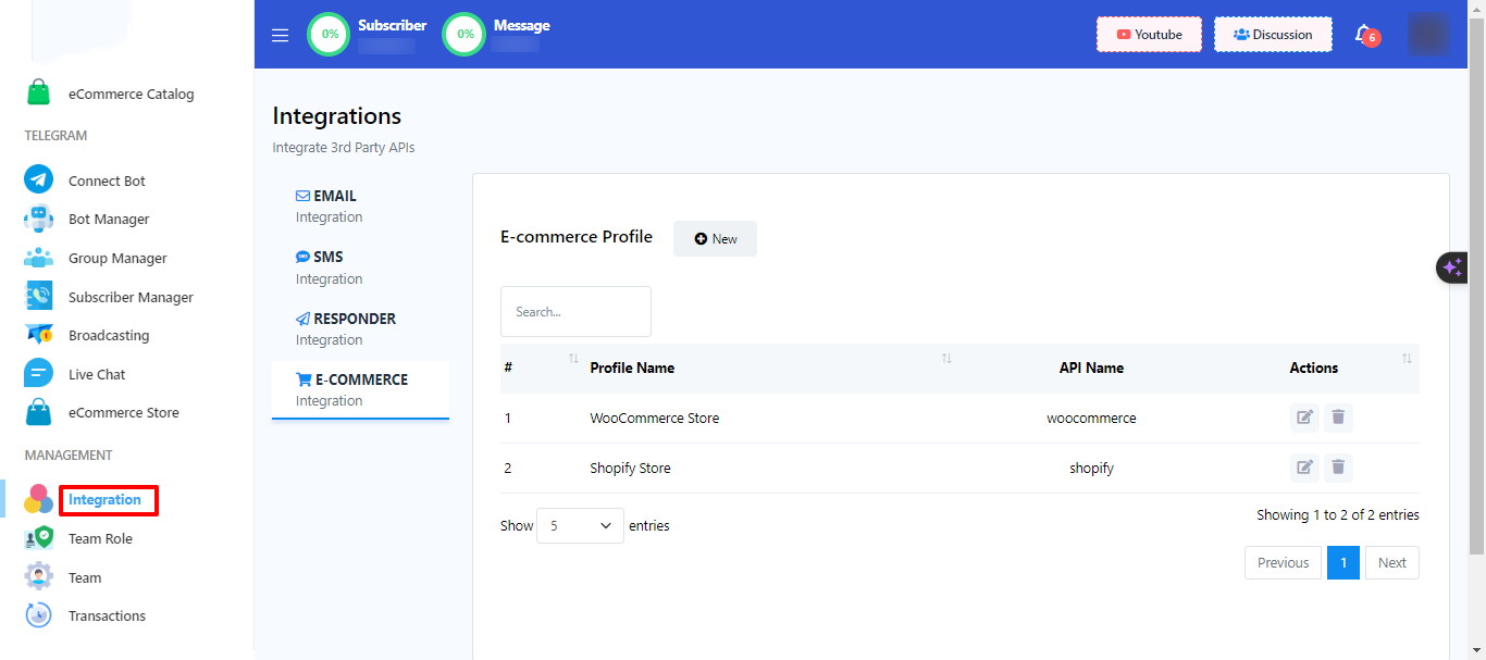 - Dentro del menú Integración, haga clic en la categoría `Comercio electrónico`.