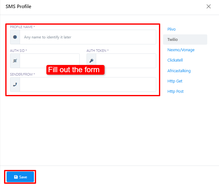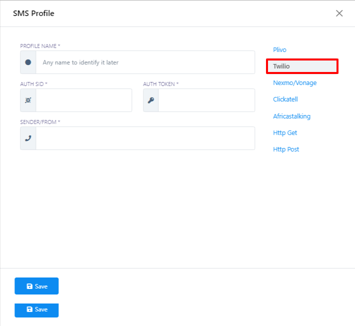 - A los efectos de esta guía, demostraremos el proceso utilizando Twilio como proveedor de servicios de SMS elegido. Por lo tanto, haga clic en la opción `Twilio`.