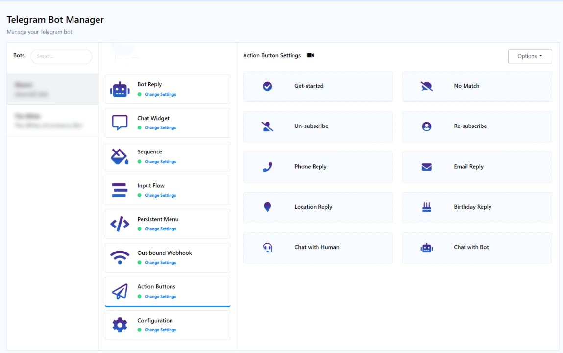 La sección Botón de acción es una colección de elementos personalizables dentro de Telegram Bot Manager. Estos elementos permiten a los usuarios especificar acciones o plantillas particulares que el bot debe realizar cuando se activa. Desempeñan un papel fundamental en la configuración del comportamiento y el flujo del bot, permitiendo a los usuarios incorporar estos elementos en cualquier flujo de trabajo del bot que deseen.