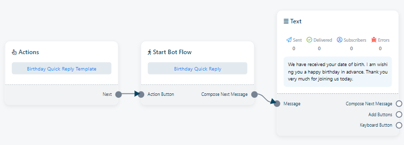 Respuesta de cumpleaños: "Respuesta de cumpleaños" es una plantilla de mensaje preestablecida que entra en juego cuando un bot recibe la fecha de cumpleaños de un usuario. Los usuarios tienen la opción de configurar esta respuesta de cumpleaños para usarla con cualquier bot.
