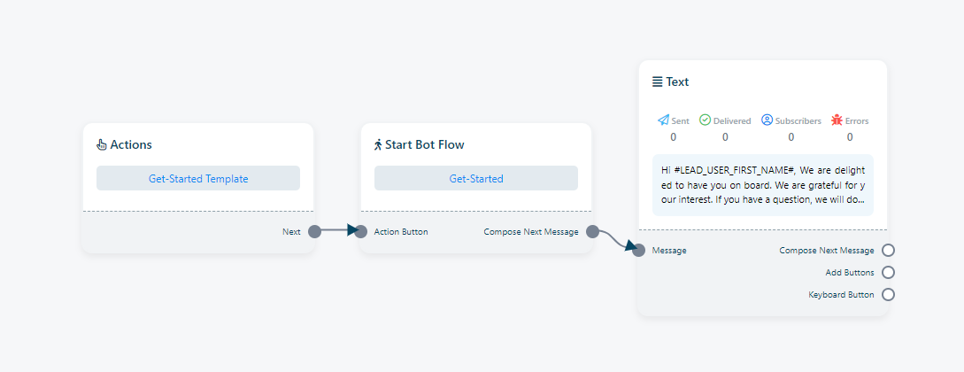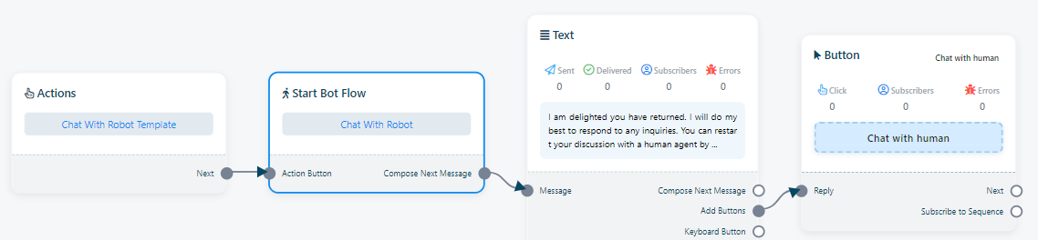 Comenzar: la función "Comenzar" está diseñada para iniciar un flujo de bot sin requerir palabras clave específicas. Dentro de Telegram, hay un botón "Inicio" y al hacer clic en él se activa el bot Comenzar. Los usuarios tienen la flexibilidad de personalizar este bot de introducción.