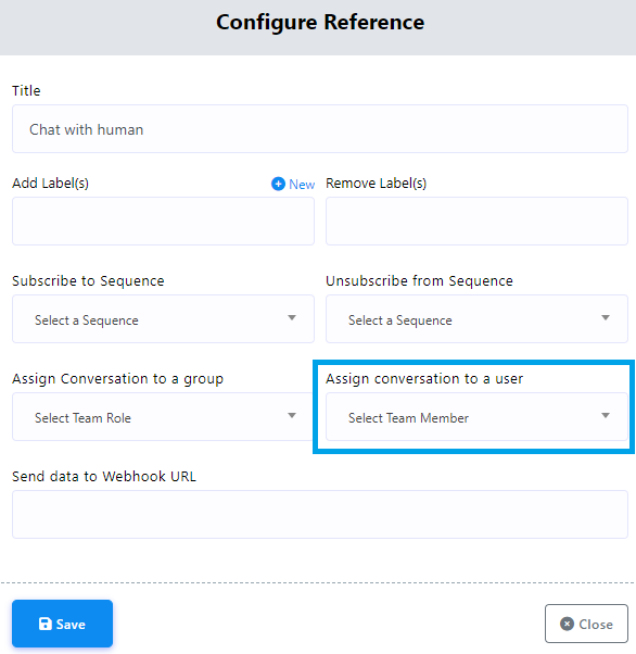- Si es necesario, puede asignar una conversación a un usuario específico seleccionando "Iniciar flujo de bot"> "Asignar conversación a un usuario". Esto asigna un agente a la conversación que se comunicará con el usuario cuando los suscriptores hagan clic en "Chatear con humanos".