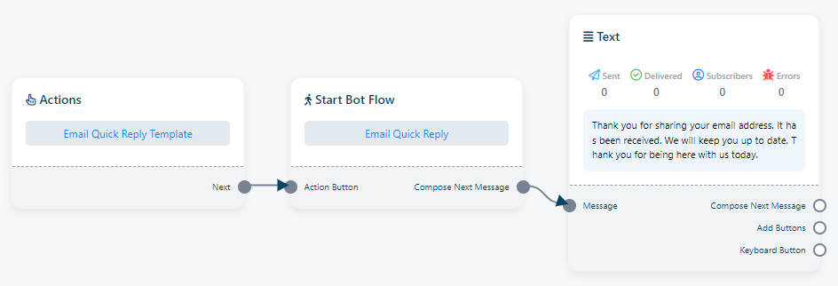 Respuesta por correo electrónico: de manera similar, "Respuesta por correo electrónico" es una plantilla de mensaje preconfigurada disponible para usar cuando un bot recibe una dirección de correo electrónico de un usuario. Los usuarios pueden asignar esta respuesta por correo electrónico a cualquier bot según sea necesario.