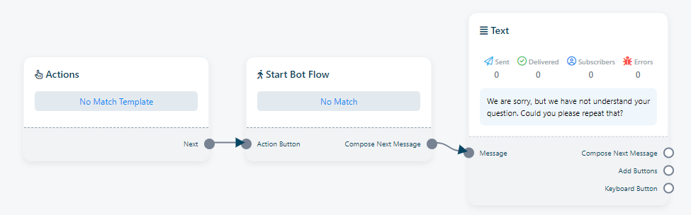 Plantilla sin coincidencias: la "Plantilla sin coincidencias" actúa como una respuesta o mensaje preestablecido que se entrega cuando el bot no puede localizar una respuesta de bot específica para palabras clave o mensajes específicos. Esta plantilla es útil para manejar situaciones en las que el bot recibe mensajes de usuario que no se alinean con ninguna intención o comando predefinido. Los usuarios pueden personalizar esta respuesta del bot No Match haciendo clic en "No Match" para adaptar la respuesta del bot a tales situaciones.