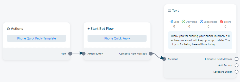 Respuesta telefónica: "Respuesta telefónica" es una plantilla de mensaje prediseñadas que se puede implementar cuando el bot recibe un número de teléfono de un suscriptor. Tiene la flexibilidad de utilizar esta "Respuesta telefónica" para cualquier bot. Este botón de acción "Respuesta telefónica" también es editable.
