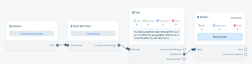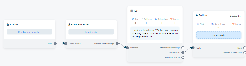 Volver a suscribirse: "Re-suscribirse" se refiere al proceso en el que un usuario que se había dado de baja previamente para no recibir mensajes o notificaciones del bot decide volver a participar o reanudar su interacción con el bot. Esta característica juega un papel importante en el mantenimiento de la participación de los usuarios y les brinda la flexibilidad de volver a interactuar con el chatbot en caso de que cambien de opinión.