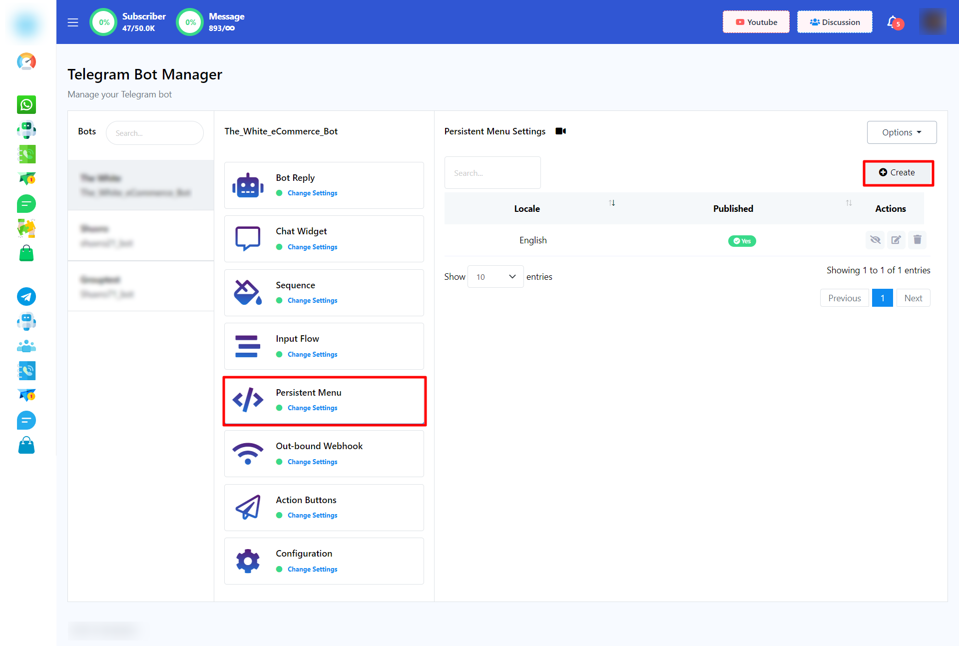 - Navegue hasta Telegram Bot Manager y acceda a la sección "Menú persistente" desde la barra lateral izquierda.