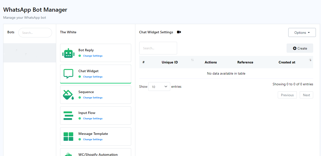 - Dentro del Administrador de Bots de WhatsApp, seleccione la sección `Chat Widget` y haga clic en el botón `Crear`. Asegúrese de que esté seleccionada la cuenta del bot de WhatsApp para la cual se creará el widget de chat.